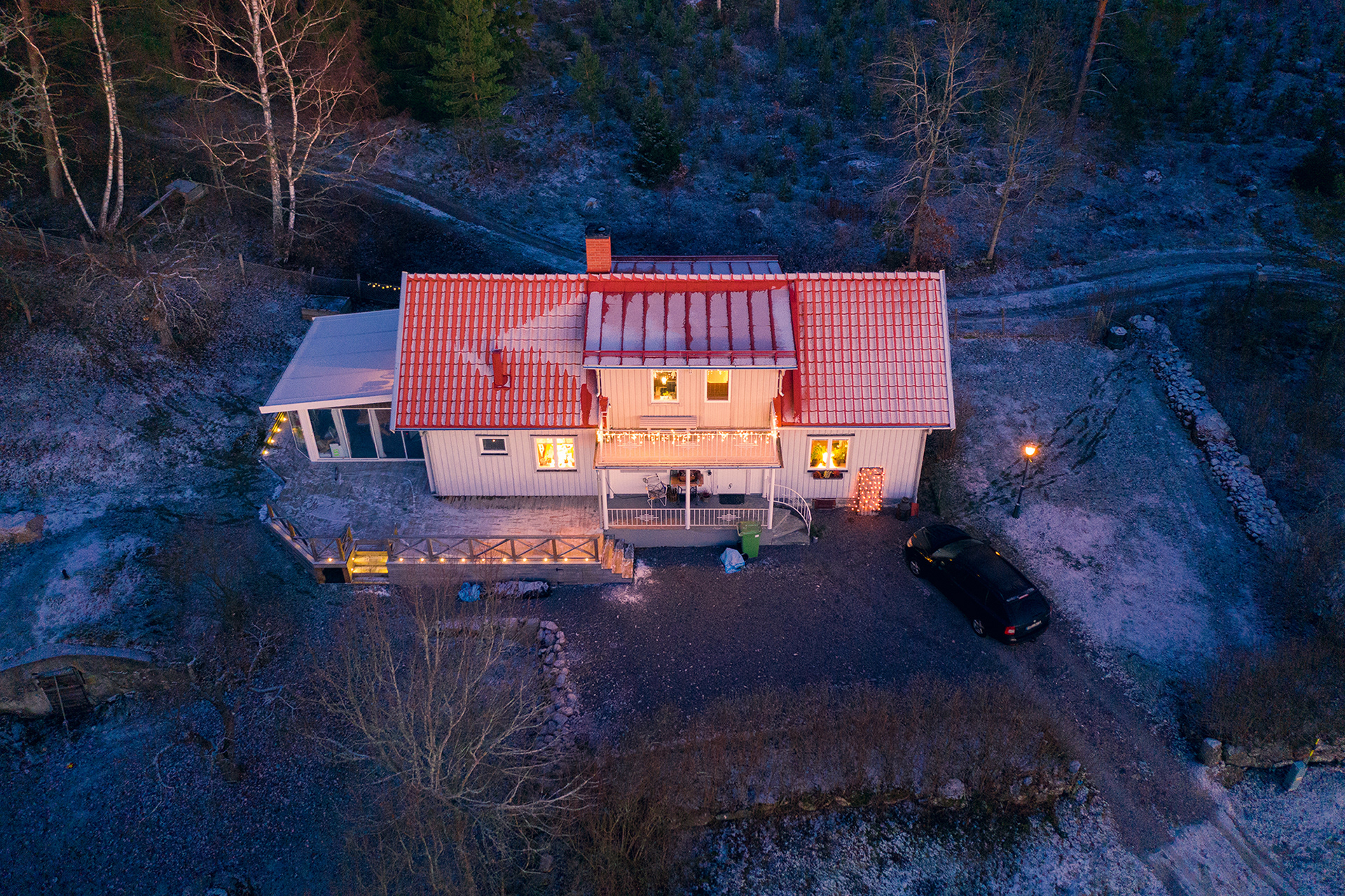 Stämningsfulla kvällsfotografier över byggnad. Allt handlar om ljuset. Att vänta in rätt tidpunkt. Här ligger även ett litet snötäcke som bidrar till kontrast mot träden och huset.