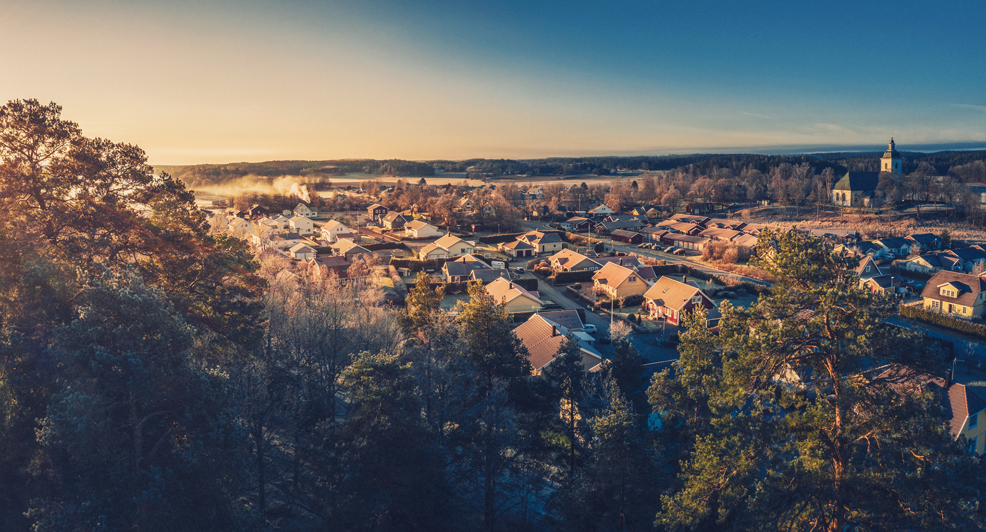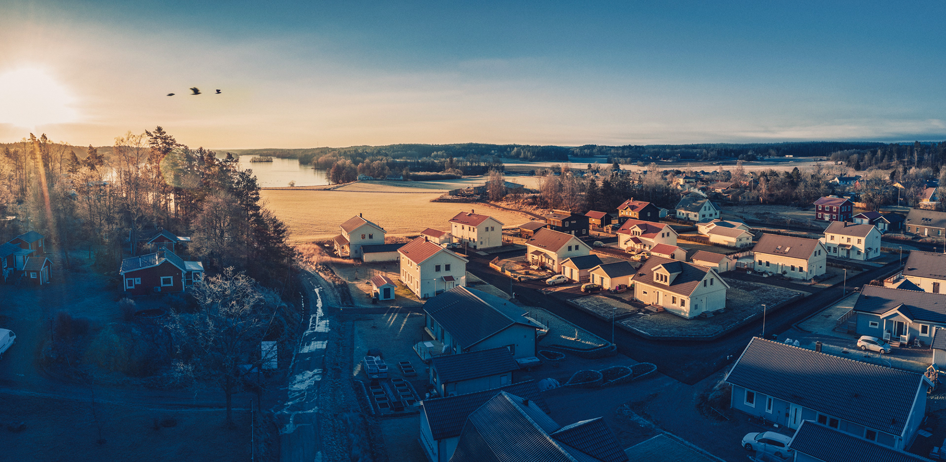 Morgonsolen i mars värmer det nybyggda området i Bankekind, strax utanför Linköping, med utsikt över Svinstadsjön.