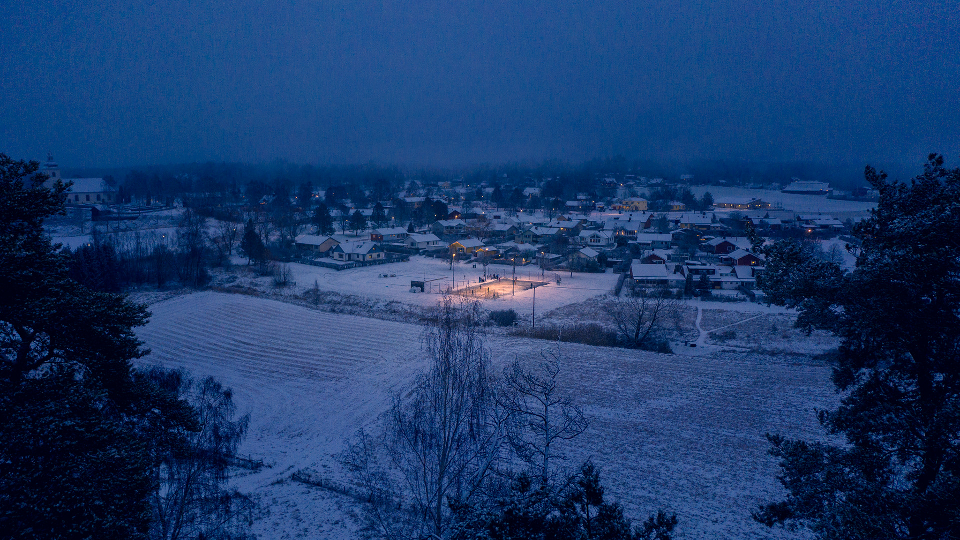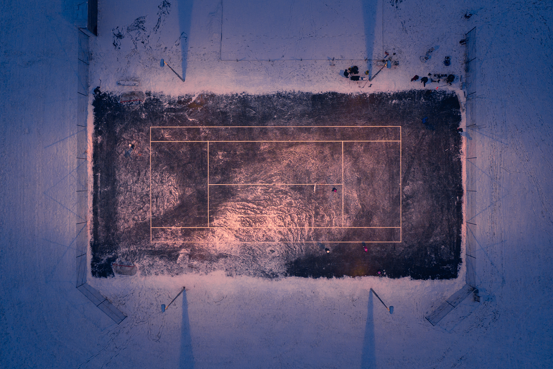 En sen eftermiddag i januari. Lokalbor samlas på den spolade tennisplanen för att åka skridskor.